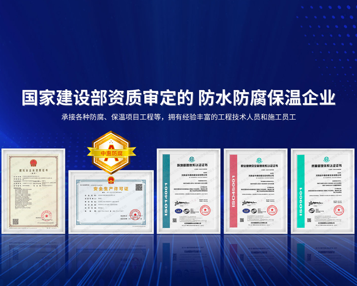 公司經營范圍:防水防腐保溫工程;消防設施工程;建筑裝修裝飾工程;建筑機電安裝工程;電力工程;建筑工程;石油化工工程;工業清洗工程;油罐清洗工程;鋼結構工程;環保工程;模板腳手架工程;電纜防火封堵、防污閃噴涂、外墻外保溫工程;各類施工勞務作業;設備維修、船舶鉚焊、涂裝;電力工程材料、建材、防水材料、防火材料、防腐保溫材料銷售,并相繼通過了GB/T19001-2008idtISO9001:2008GB/T50430-2007質量管理體系認證證書。GB/T24001-2004idtISO14001:2004環境管理體系認證證書。GB/T28001-2011idtOHSAS18001:2007職業健康安全管理體系認證證書。公司是中國防腐蝕于防護協會、中國施工企業管理協會、電力協會和中國鋼結構防水協會會員單位?! 」镜慕洜I業務涵蓋了石油、化工、電力、冶金、煤炭、船舶、國防、燃氣、水利、環保、交通運輸、航空及國防軍工和輕紡市政等行業的防腐保溫絕熱設備。鋼結構安裝、防火、防水、金屬噴鍍、聚脲噴繪、陰極保護、防滲透堵漏、玻璃鋼及各種磚版材料襯里、橡膠襯里、煙氣硫和耐酸溶劑腐蝕等工程施工。公司連續十年榮獲“省市先進施工企業”“安全生產先進單位”“重合同,守信用企業”和“AA***資質企業”的稱號。2000年被命名為市級文明單位,2002年被國家工商行政管理局命名為“重合同,守信用的企業”、被中國工業防腐蝕技術協會命名為“防腐蝕企業,能源節約及環境保護領域有豐富的經驗和***的業績。工程一次交驗合格率100%。其中攀枝花鋼鐵公司煉鐵廠四號高爐及熱風爐防腐工程、上海寶鋼公司煤氣柜防腐工程、撫順石油一廠裝置防腐項目、齊魯石化公司稀烴廠高塔防腐工程、吉林化學工業公司煉油廠油罐防腐工程、天津石化熱電廠六號爐頂棚聯絡管保溫工程、大慶油田(太倉)力神泵業工程、中國化學工程第十一建設工程、中原油田勘探局工程、中國石化銷售有限公司華北分部、魯皖輸油管道工程、貴州開磷息烽合成氨工程、陜西黃陵煤化工程、中國石油天然氣西部管道塔里木輸油工程、邯鋼集團邯寶鋼鐵公司煉鐵工程、德州供電工程、吉寶(南通)船廠工程,偃師華潤熱力工程、鄭州熱力總公司。 河南省中惠防腐安裝有限公司愿以豐富的施工經驗,***的技術,***的設備,***的管理,***的服務,竭誠為國內外廣大的用戶提供***滿意、******的工程作品?! ∥夜驹概c國內外同仁一道,團結協作,共同推進防腐蝕行業發展! 公司地址:河南省長垣縣建設路北段360號 固定電話:0373-8866488 郵編:453400 網址:http://www_zhff_com_cn.xinweiyuansz.com